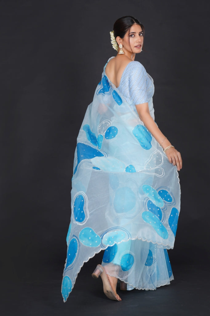 Inspired by flowing waters, this blue organza saree captures serenity and style. Light, breathable, and striking β perfect for modern occasions with a traditional touch.