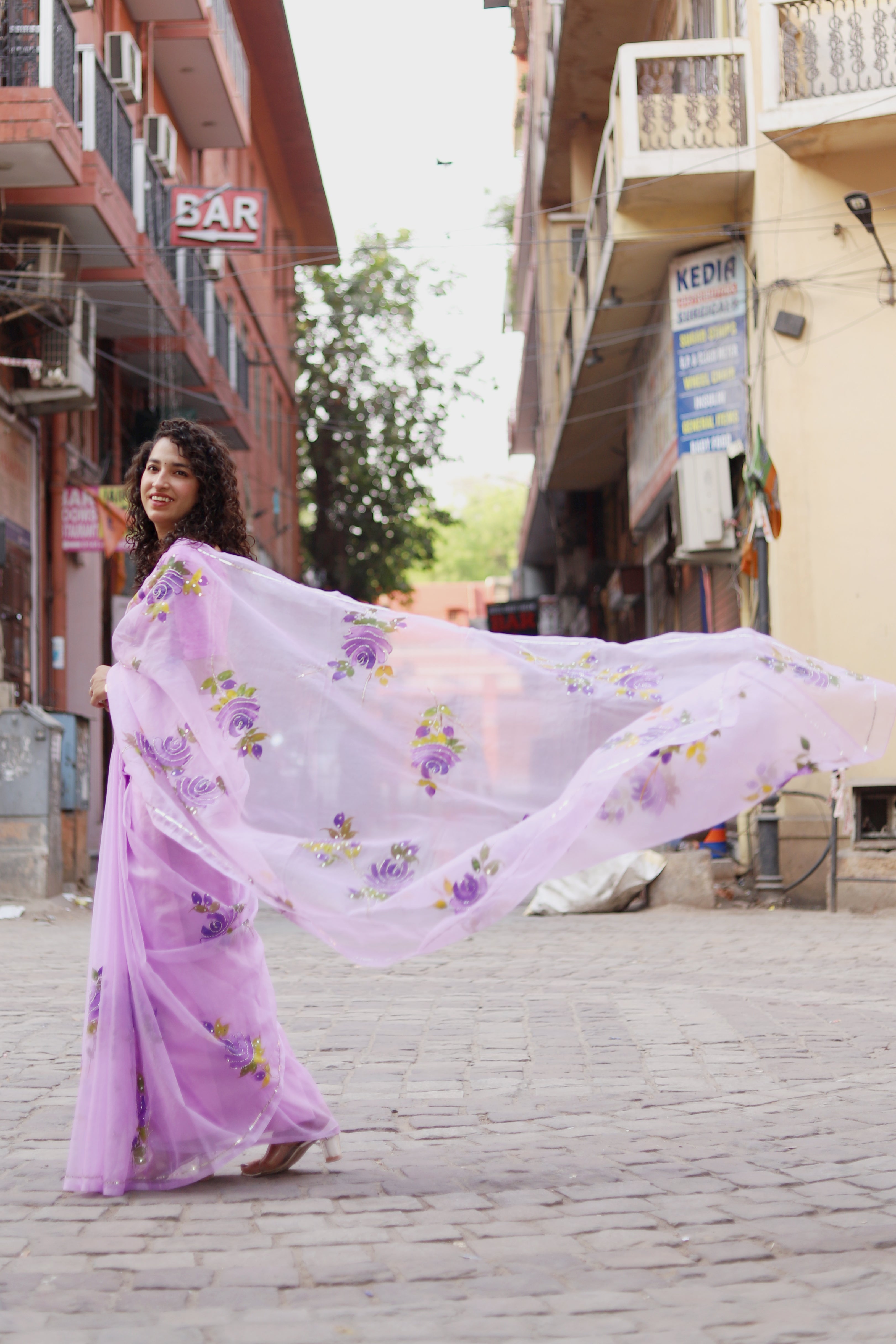 Baby Pink Organza Saree with Oversized Fuchsia Floral AppliquΓ©