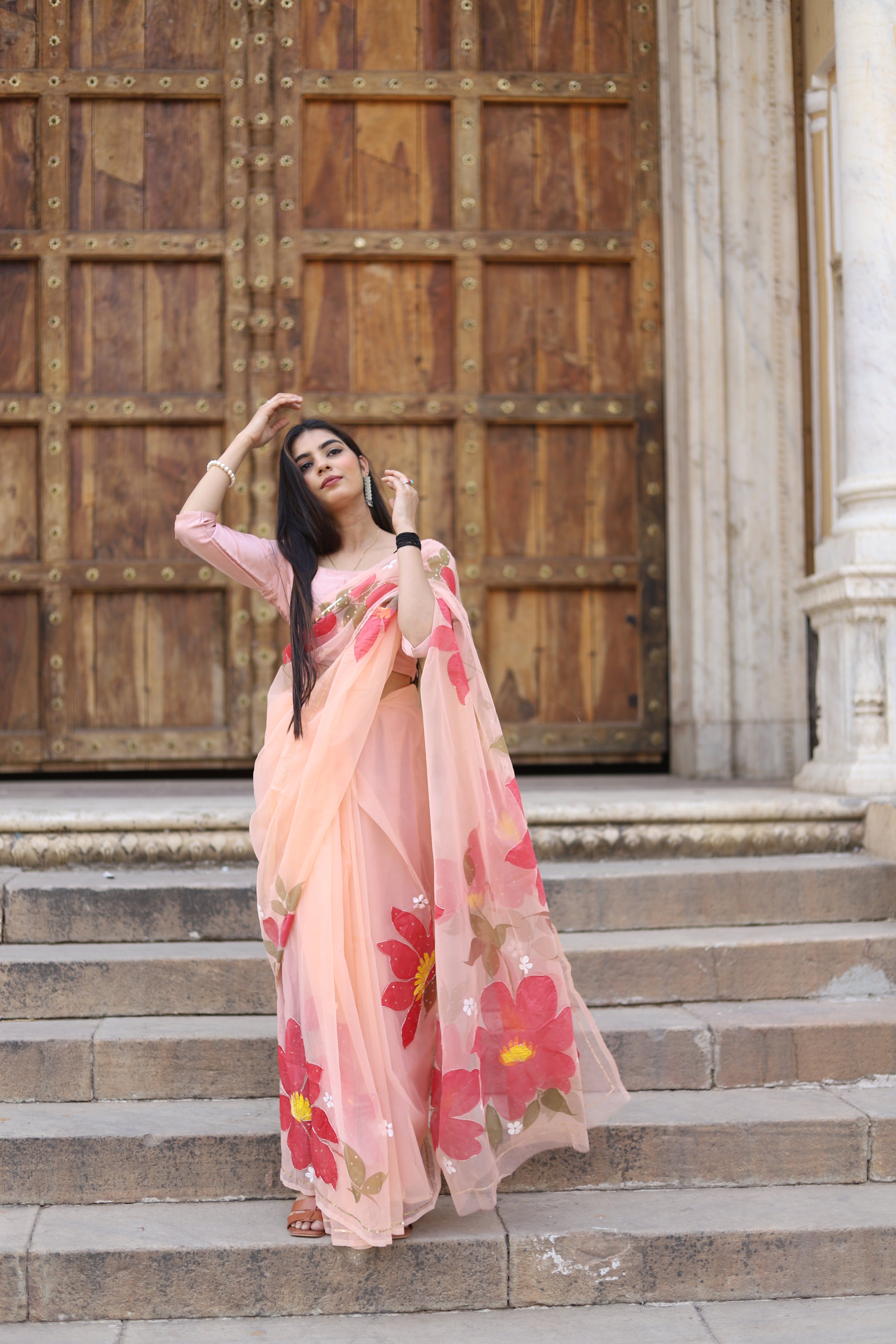 Peach Organza Saree with Hand-Painted Dragonfly & Meadow Motifs