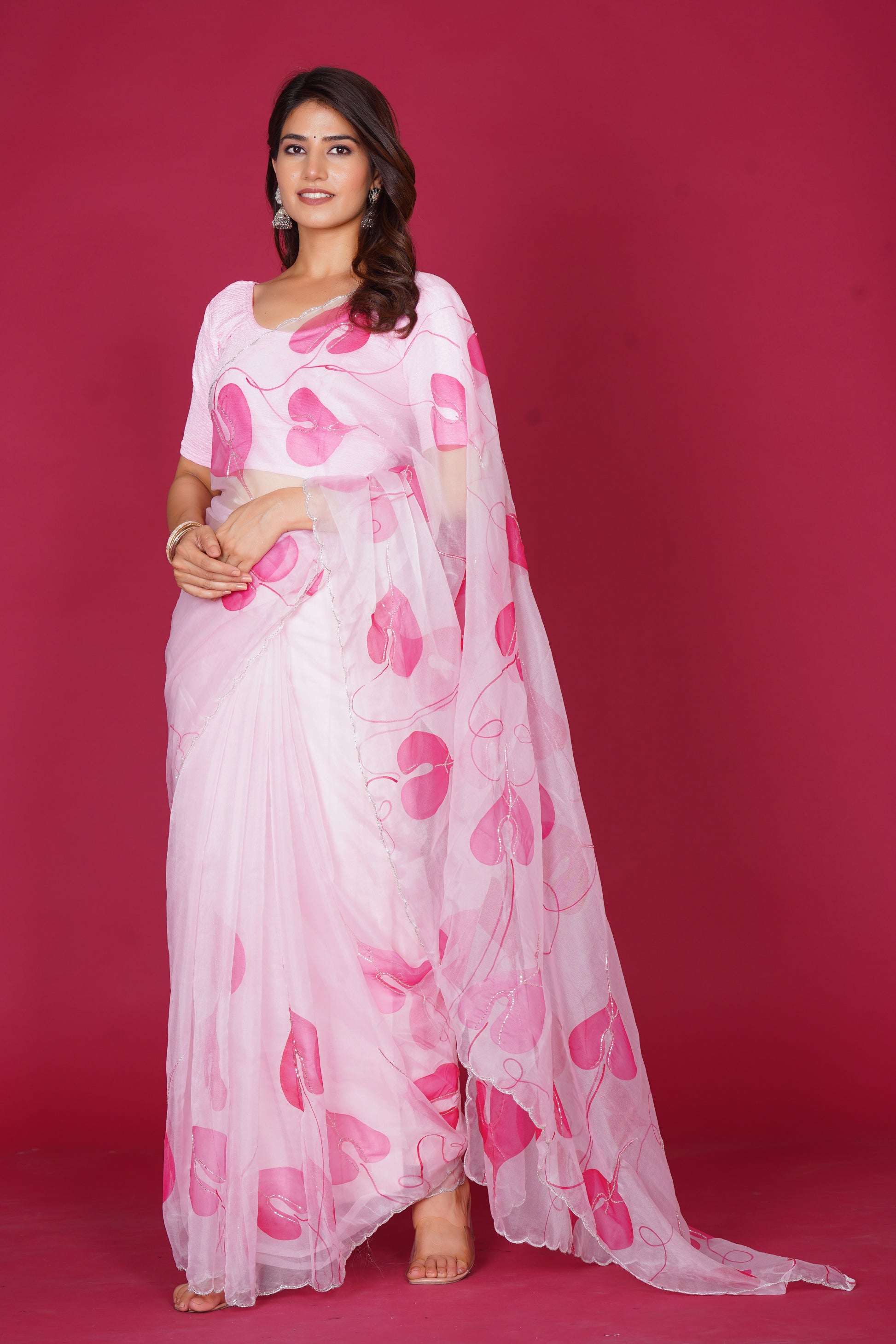 Leaf Organza – White Saree with Pink Leaf Motifs